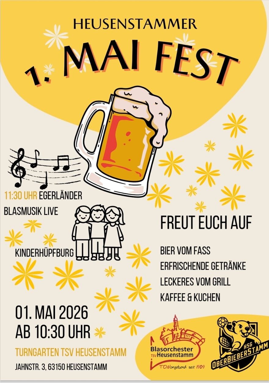 Die Handballer der TGS Bieber sind seit 2025 Teil der HSG OberBieberStamm und haben jetzt zusammen mit dem TSV Blasorchester ein neues Event auf die Beine gestellt: Am Tag der Arbeit laden wir zum 1. Mai Fest ein, mitten in Heusenstamm im Turngarten der TSV (Jahnstr. 3). Kommt vorbei und lasst uns gebührend feiern 🥳