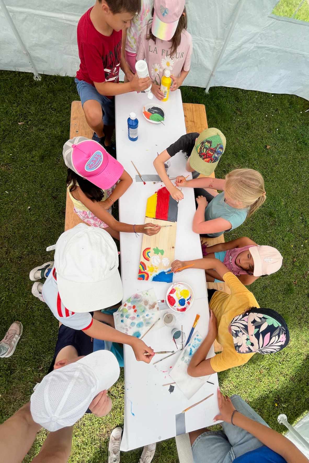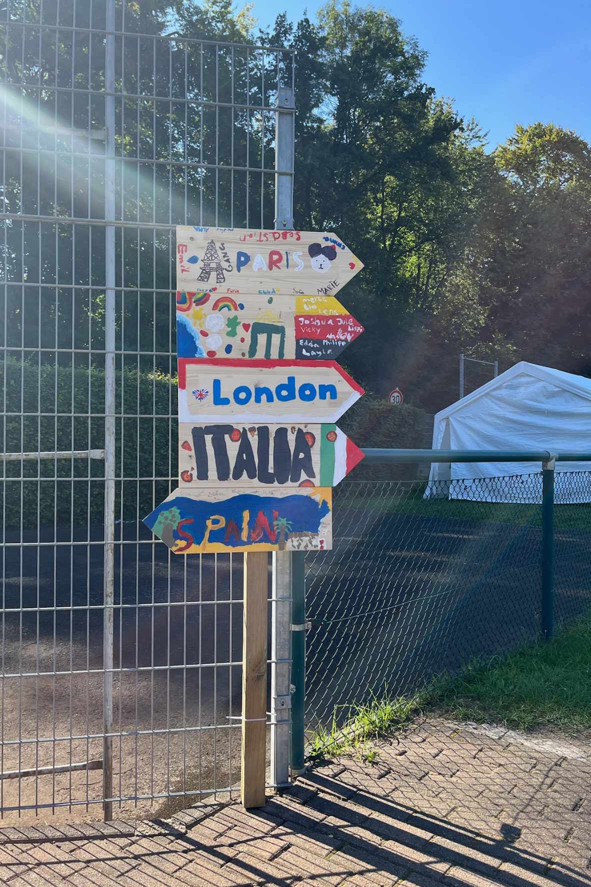 Der Tag galt dem Kennenlernen untereinander und unserer Teamer, welche die Kinder die Woche über begleiteten. Es wurden Gruppenspiele gespielt, Destinationen ausgewählt und passende Schilder gebastelt ehe es Mittagessen auf der Terrasse gab. Am Nachmittag hatten die Kinder dann die Möglichkeit an verschiedenen Angeboten wie Batiken, Wasserspielen, Corn hole basteln oder Barfußpfad teilzunehmen.