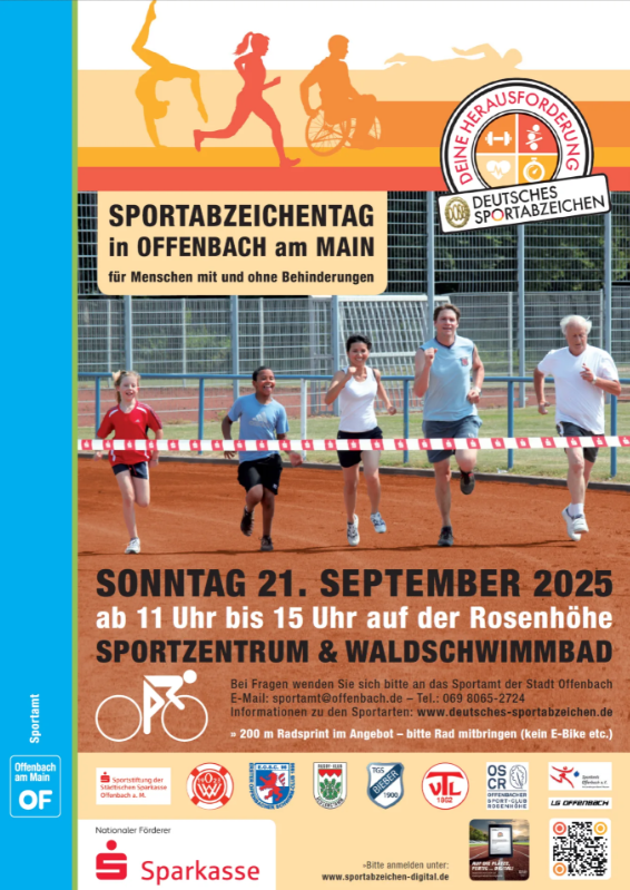 Du suchst nach einer neuen Herausforderung? Dann komm zum Sportabzeichentag in Offenbach! Egal ob du schon immer mal das Deutsche Sportabzeichen machen wolltest oder einfach nur Spaß an Bewegung hast – bei uns bist du genau richtig. Egal ob solo, mit Freunden oder der Familie – gemeinsam meistern wir die Herausforderungen. Die zu erbringenden Leistungen orientieren sich an den motorischen Grundfähigkeiten Ausdauer, Kraft, Schnelligkeit und Koordination und unterscheiden sich je Altersklasse.