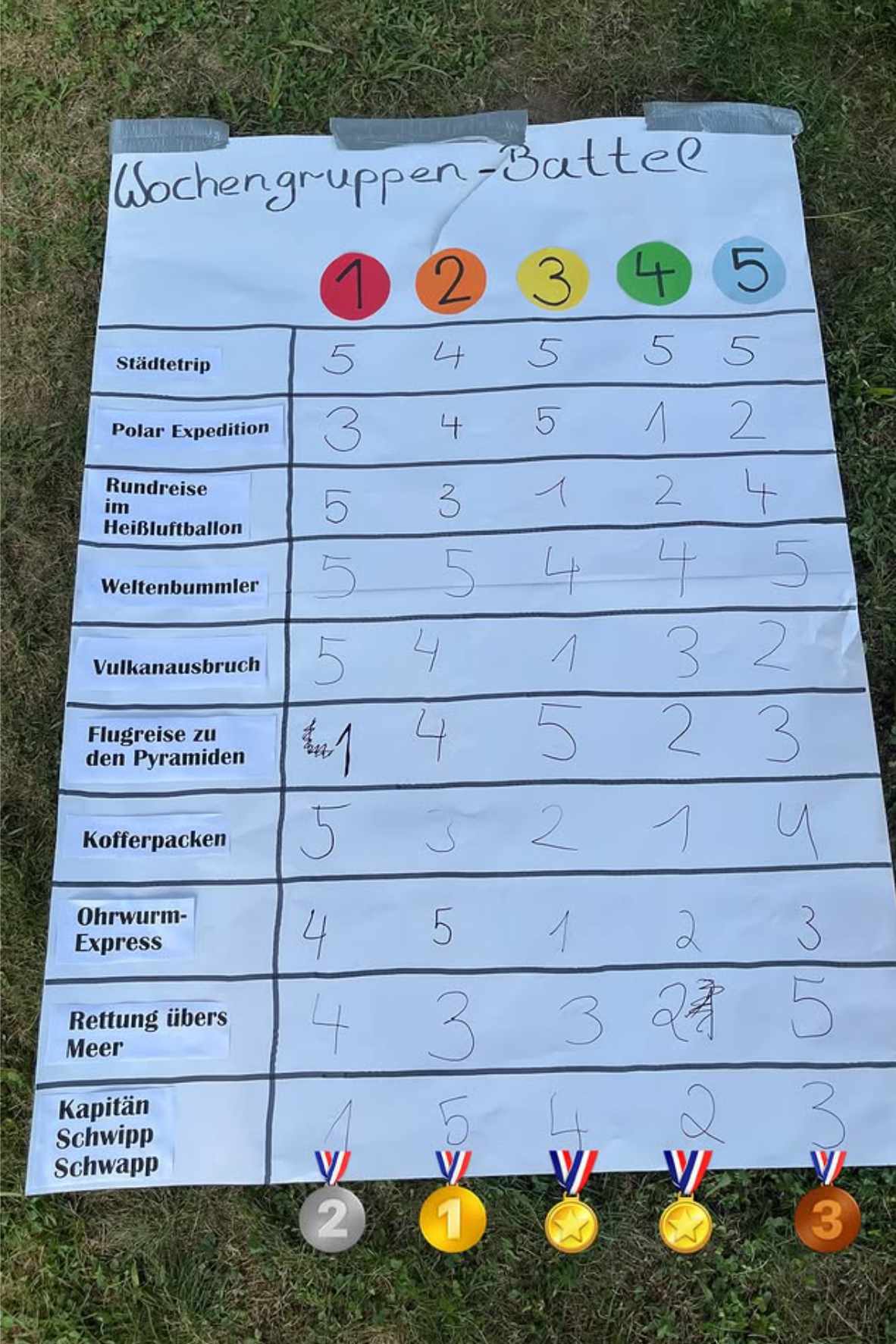 Am heißesten Tag der Woche fand unser Wochengruppen Battle statt. Die fünf Gruppen kämpften in zehn Mini-Spielen um wichtige Punkte für den Tagessieg. Beim Quiz, Lieder erraten, der Polar Expedition usw. waren verschiedenste Fähigkeiten gefordert. Nach einer Stärkung beim Mittagessen standen noch die Wasserspiele Kapitän Schwipp Schwapp und Rettung übers Meer an. Die Abkühlung war sehr gern gesehen und endete einer kleinen Wasserschlacht, denen insbesondere unsere Teamer Jonas, Felix und Jule zum Opfer wurden 😉 Am Nachmittag konnten alle bei unserem Spiel und Bastel Angeboten wieder trocknen.