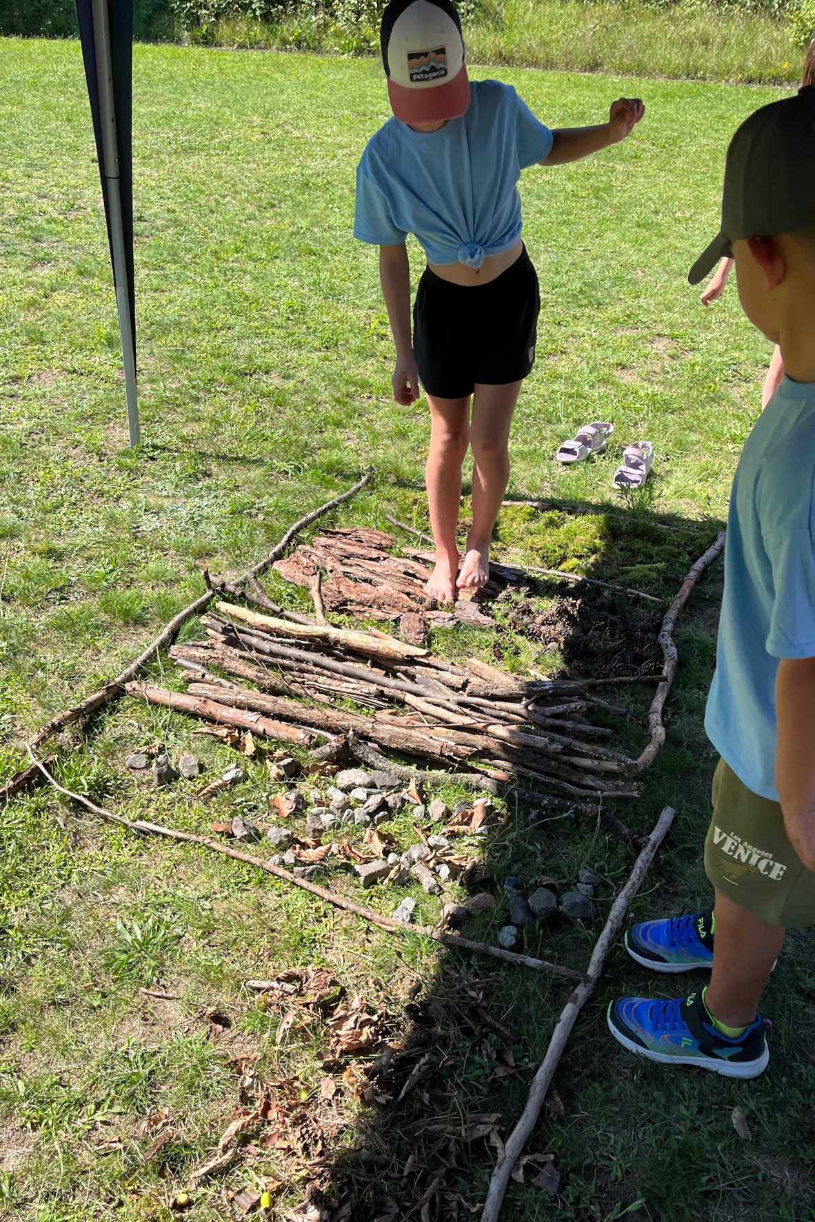 Der Tag galt dem Kennenlernen untereinander und unserer Teamer, welche die Kinder die Woche über begleiteten. Es wurden Gruppenspiele gespielt, Destinationen ausgewählt und passende Schilder gebastelt ehe es Mittagessen auf der Terrasse gab. Am Nachmittag hatten die Kinder dann die Möglichkeit an verschiedenen Angeboten wie Batiken, Wasserspielen, Corn hole basteln oder Barfußpfad teilzunehmen.