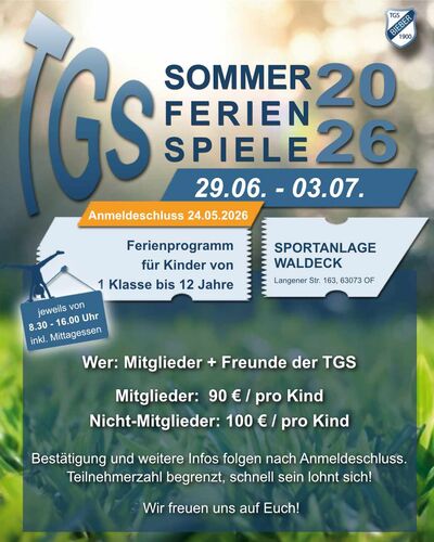 Es ist wieder soweit! Dieses Jahr finden wieder die TGS-Ferienspiele vom 29.06.-03.07.2026 (1. Sommerferienwoche) statt. Anmeldeschluss ist der 24.06.2026